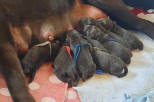 Ein Rüde kam leider Tod auf die Welt, alle anderen sind munter und fidel. Sie entwickeln sich prächtig.